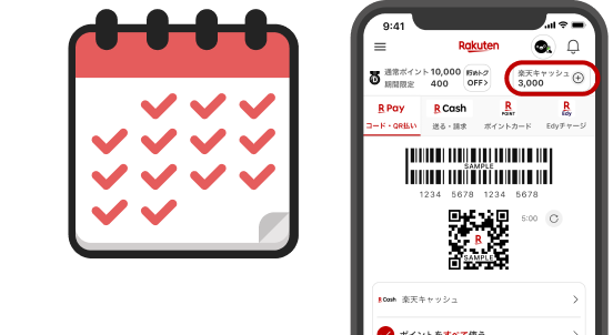 - 本キャンペーン期間中に楽天キャッシュのチャージが完了している必要がありますので、ご注意ください。