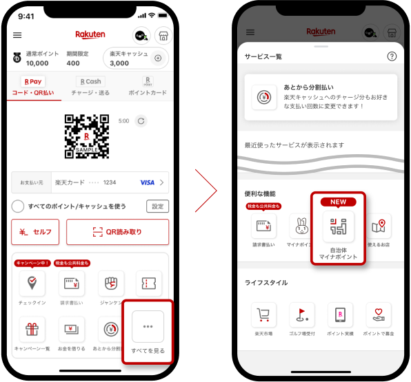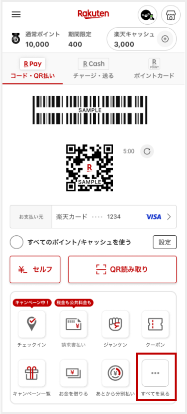 楽天ペイアプリホーム画面下部の[すべてを見る]をタップ -