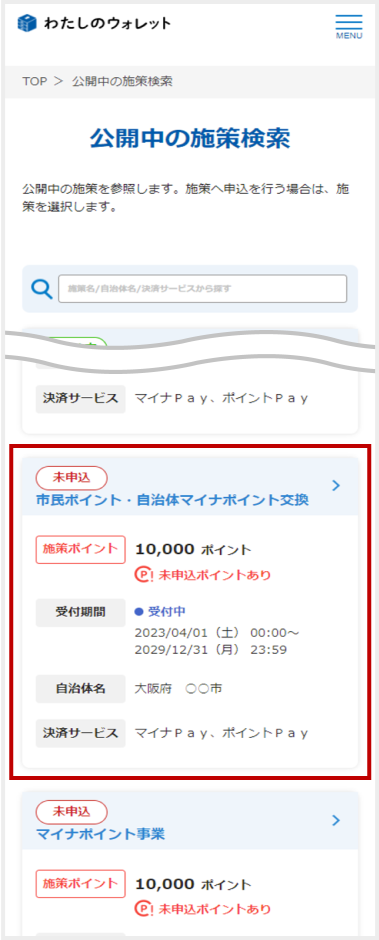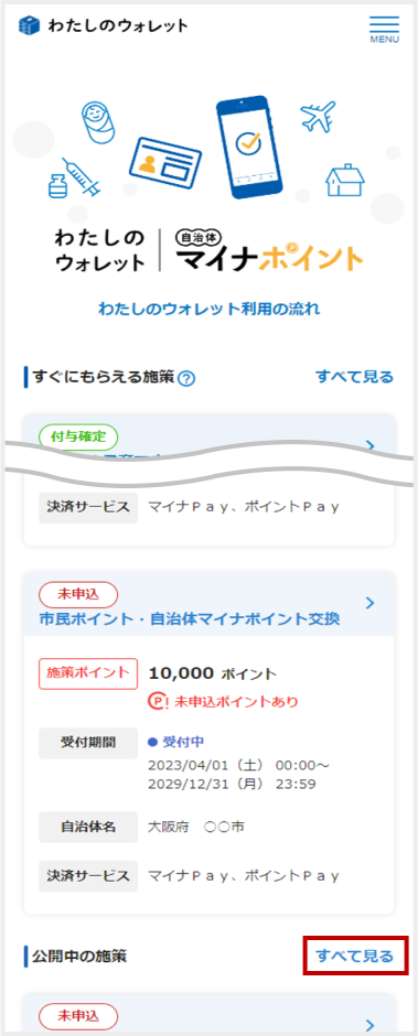 マイナポータルアプリ内e-私書箱の「わたしのウォレット」TOPにある「公開中の施策」から[すべて見る]をタップ -