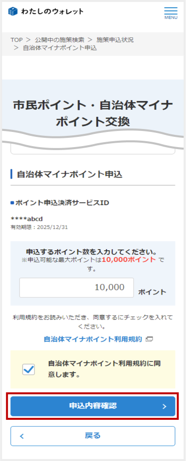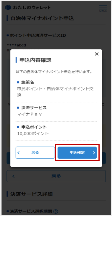 選択した自治体の施策情報とポイントを受け取る決済サービスを確認後に[申込確定]をタップ -