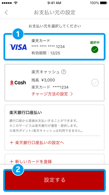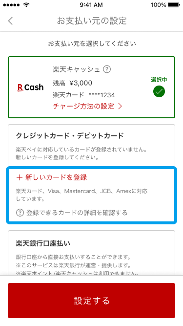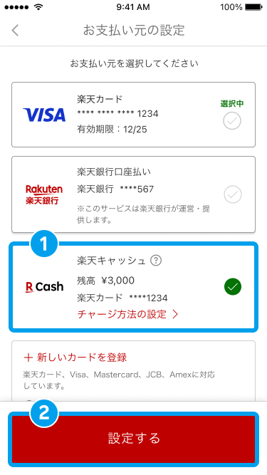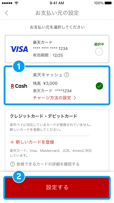 楽天キャッシュを選択し[設定する]を押す※別途チャージ方法の設定が必要です。