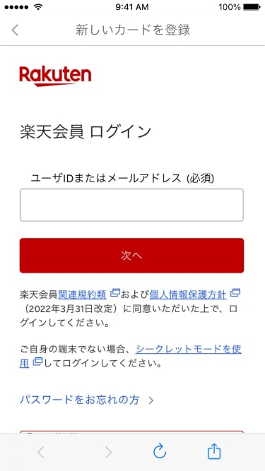 楽天会員ログインページにてログイン後、会員情報ページにてクレジットカードの登録を行う -