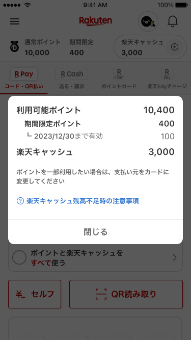 利用可能なポイント、楽天キャッシュの詳細情報を確認する