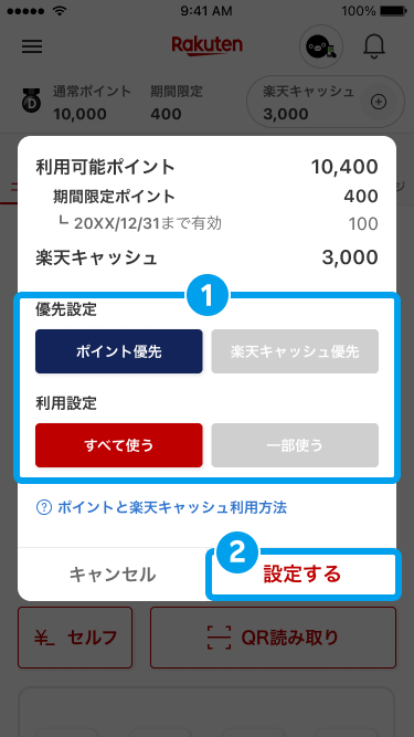 優先設定、利用設定を選択のうえ、[設定する]を押す※[一部使う]を選択した場合、一度のお会計で利用する金額を入力する